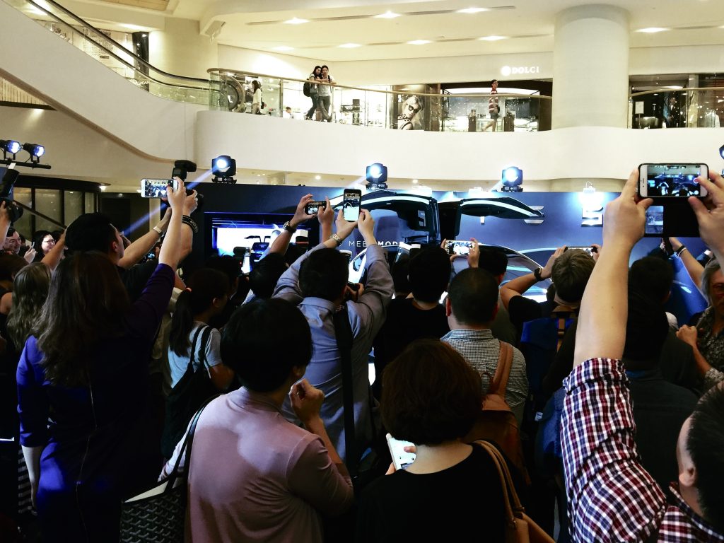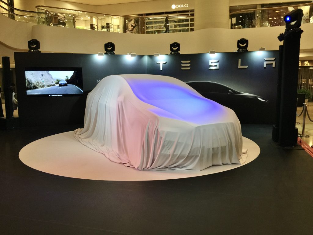 本次 Model X 的發佈活動在香港的太古廣場舉行,中庭的佈置極具現代感,與Tesla 特斯拉品牌的科技感相得益彰。進入會場,首先映入眼簾的是那輛蓋著神秘面紗的 Model X,周圍則以精緻的燈光和高科技的展示屏幕環繞,氣氛相當奢華。